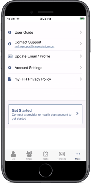 To contact myFHR support, touch the "More" tab (bottom right), and then touch "Contact Support" to send an email. The myFHR Support email address, myfhr-support@careevolution.com, is also listed on the screen, for your reference.