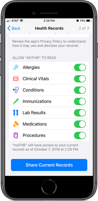 After allowing access, use the resulting screen to enable the categories of Apple Health Records that you will allow myFHR to access, and then touch "Share Current Records."