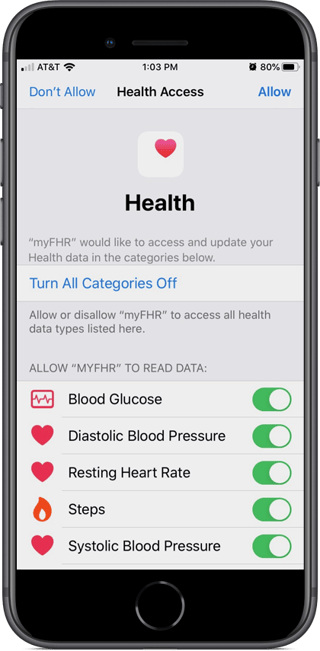 Enable the Apple Health categories you wish to share. Enable all categories by selecting "Turn All Categories On" or enable each category individually, and then select "Allow" in the upper-right corner.