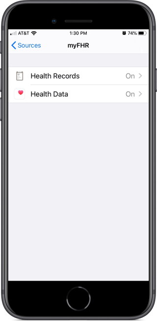 You can change your preferences at any time by going to your phone's Settings, selecting "Health → Data Access & Devices → myFHR," and enabling or disabling Health Records.