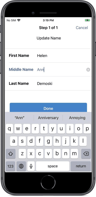 - Touch the item you would like to update (NAME, GENDER, or DATE OF BIRTH).